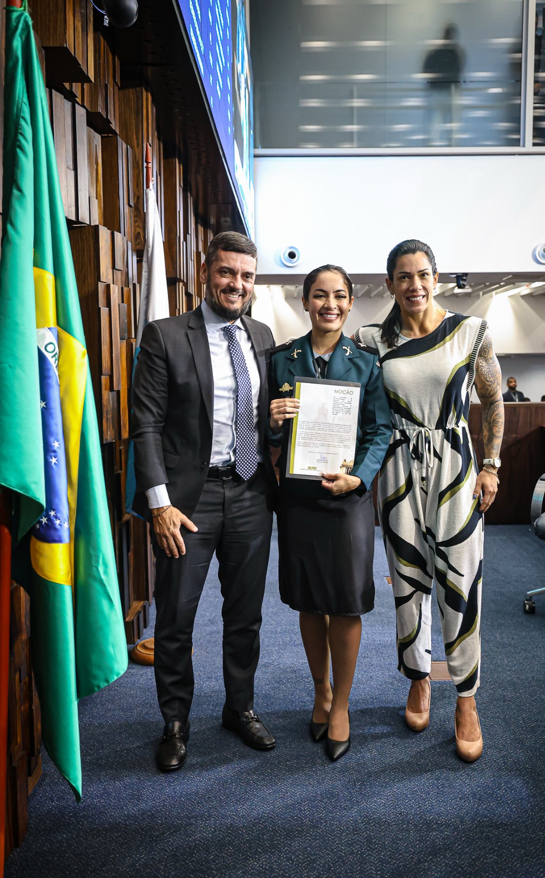 A tenente Kelly foi recebida pelo presidente da Alerj, Rodrigo Bacellar (União), que parabenizou e cumprimentou efusivamente a militar pela sua atuação.
